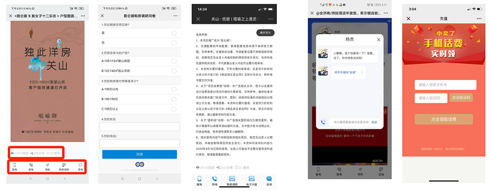 购房调研等互动功能按钮:客户阅读文章时,可直接查看项目地址、与置业顾问进行致电和咨询、还可以填写购房调研,留下个人信息。